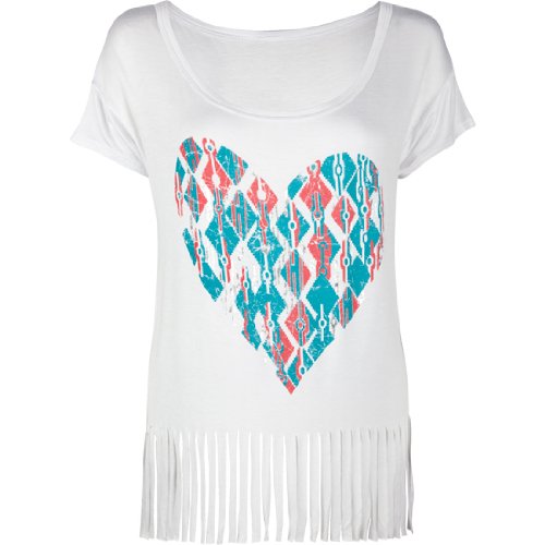 Full Tilt tee. Heart artwork on front with reflective silver accents. Fringe bottom. Short dolman sleeves. Scoop neck. 95% rayon/5% rayon. Hand wash. Imported.